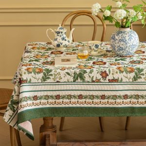 Vintage Jacquard Tablecloth with Marigold Orange Floral Design and Green Rolled Edges1